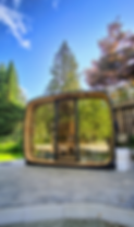 10FT long Western Red Cedar panoramic glass square barrel sauna with rounded corners, curved walls (1FT overhang). 8FT W x 8.5FT H. Features: